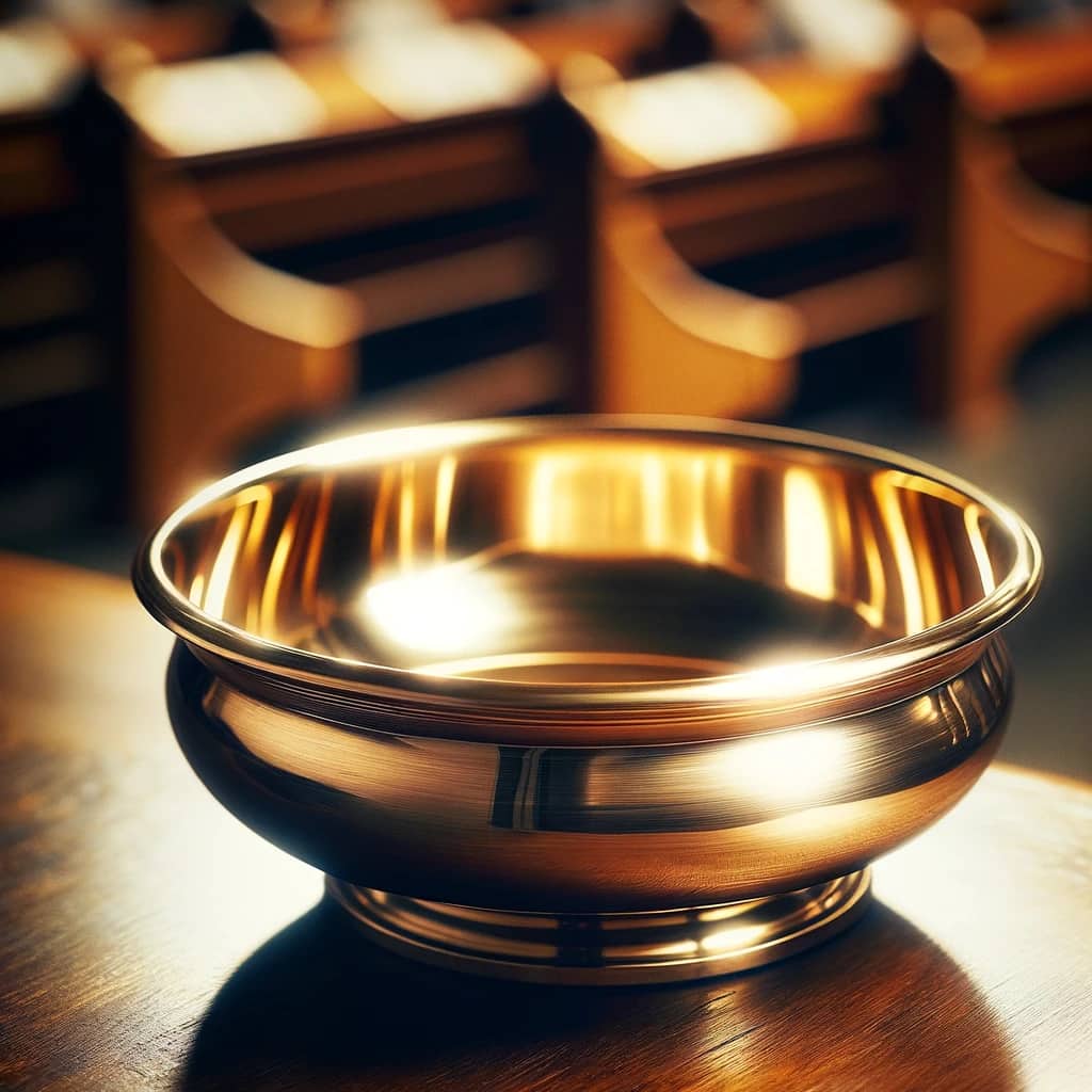 Post image created using DALL•E with prompt “A church offering plate made of brass”.