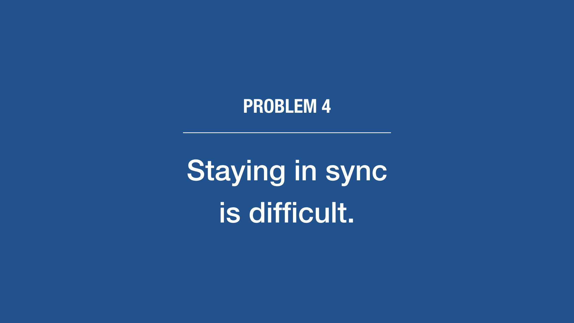 Fourth problem: Clients had great difficulty staying in sync with the server. Fitbit devices synced data every 15 minutes, but data could change more frequently. Many people used the Fitbit app on multiple platforms. A change made from the Web app on their laptop should show on their iPhone quickly. Many people also used third-party apps that could modify data and those changes from the server needed to be reflected in the app. The Fitbit apps could also be used offline and would need to reconcile changes made offline with new changes from the server when reconnected.
