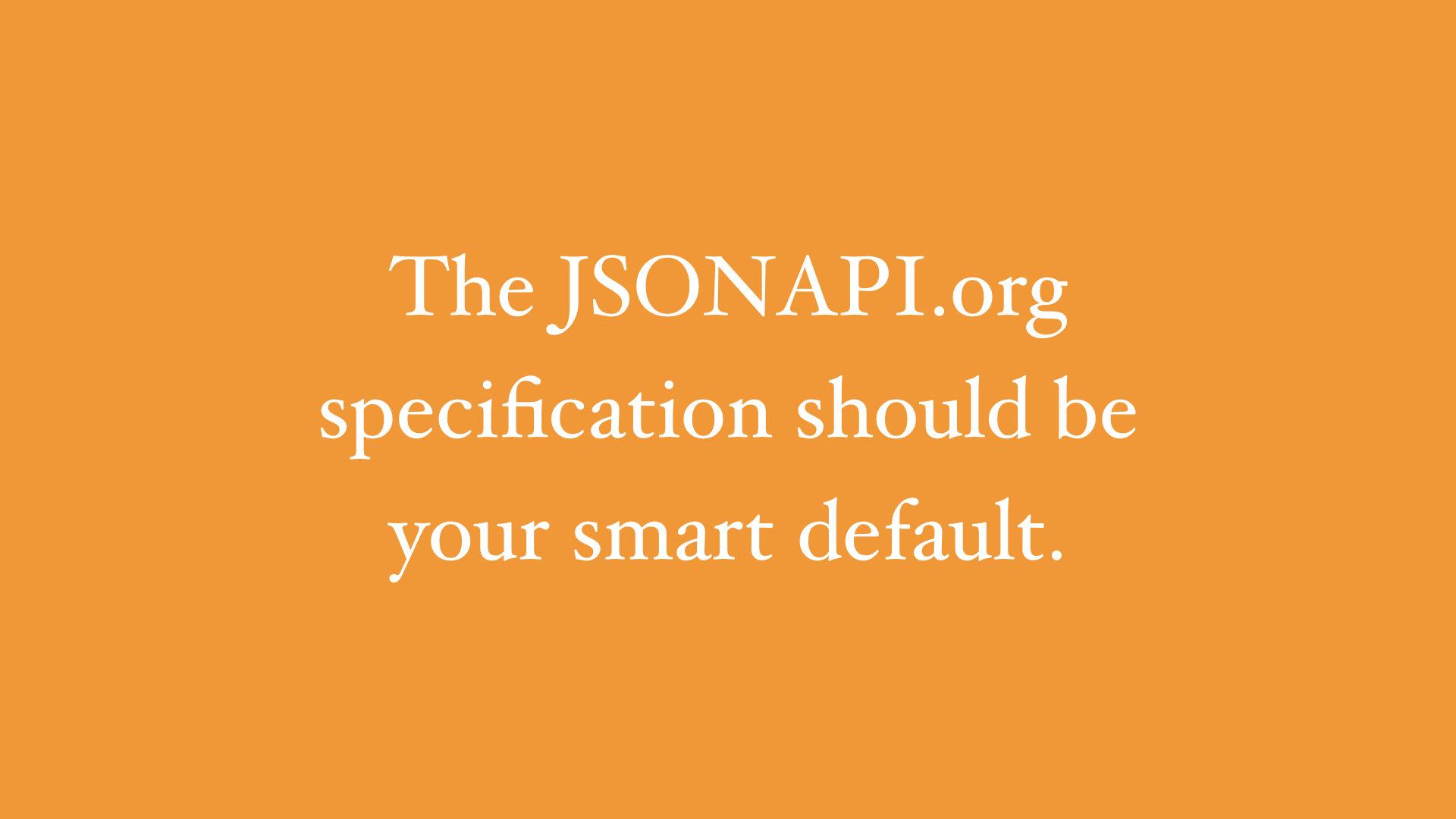 This is a talk about JSON API a.k.a. the JSONAPI.org specification, but I am not going to read the specification to you or lead a tutorial on how to use it. If you are unfamiliar with spec, that’s ok! Please stay for my talk. I hope that my talk convinces you to read more about it later today. Because ultimately, I hope to convince you that the JSONAPI.org specification should be your default style when designing Web APIs. It won't be best for every situation, but it is a great default starting point.