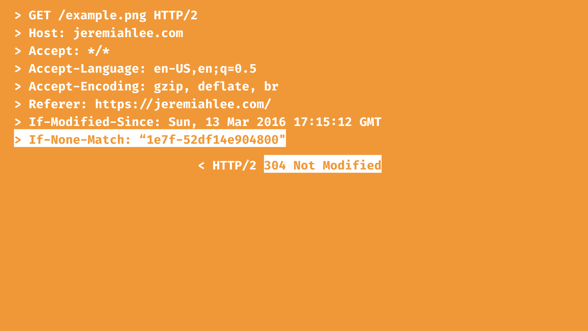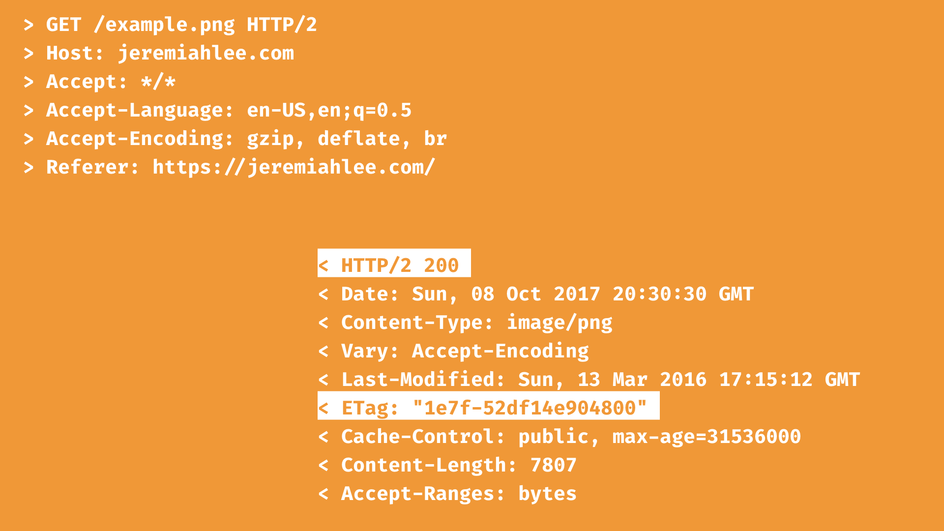 This is an example of fetching an image from a server. When the resource is returned for the first time, there is an ETag header sent with it.