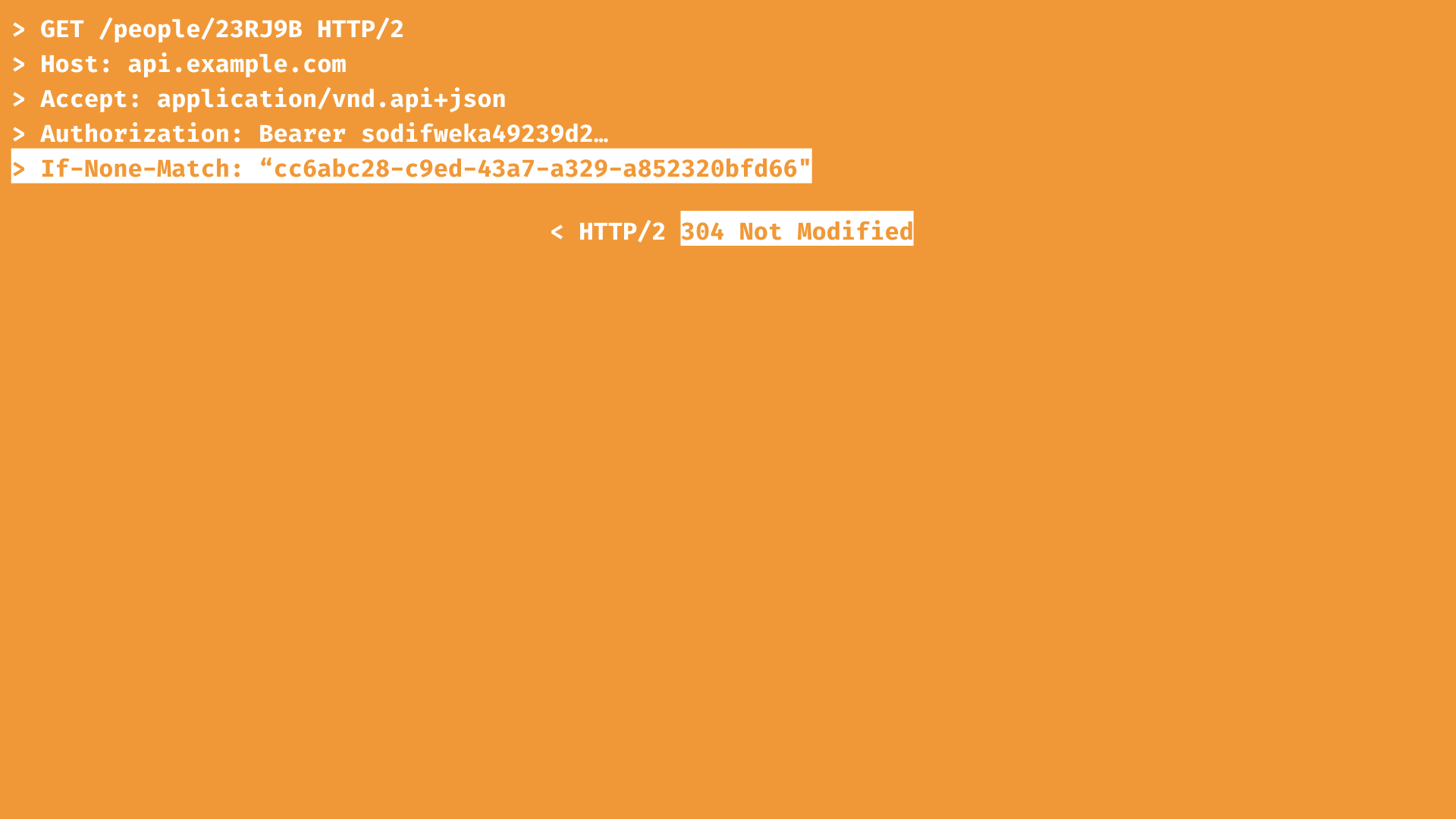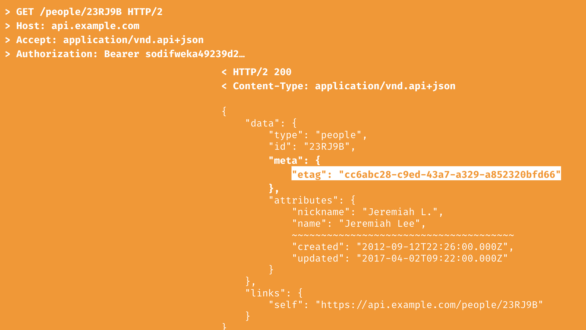 But with a JSON API response, the ETag is not returned in the header. This information is in the meta object. The ETag for a JSON API response cannot represent the exact bytes of the response because a request might have used JSON API features like sparse fieldsets or compound documents. Instead, the ETag in the meta object represents the version of ever resource and relationship returned in the response.