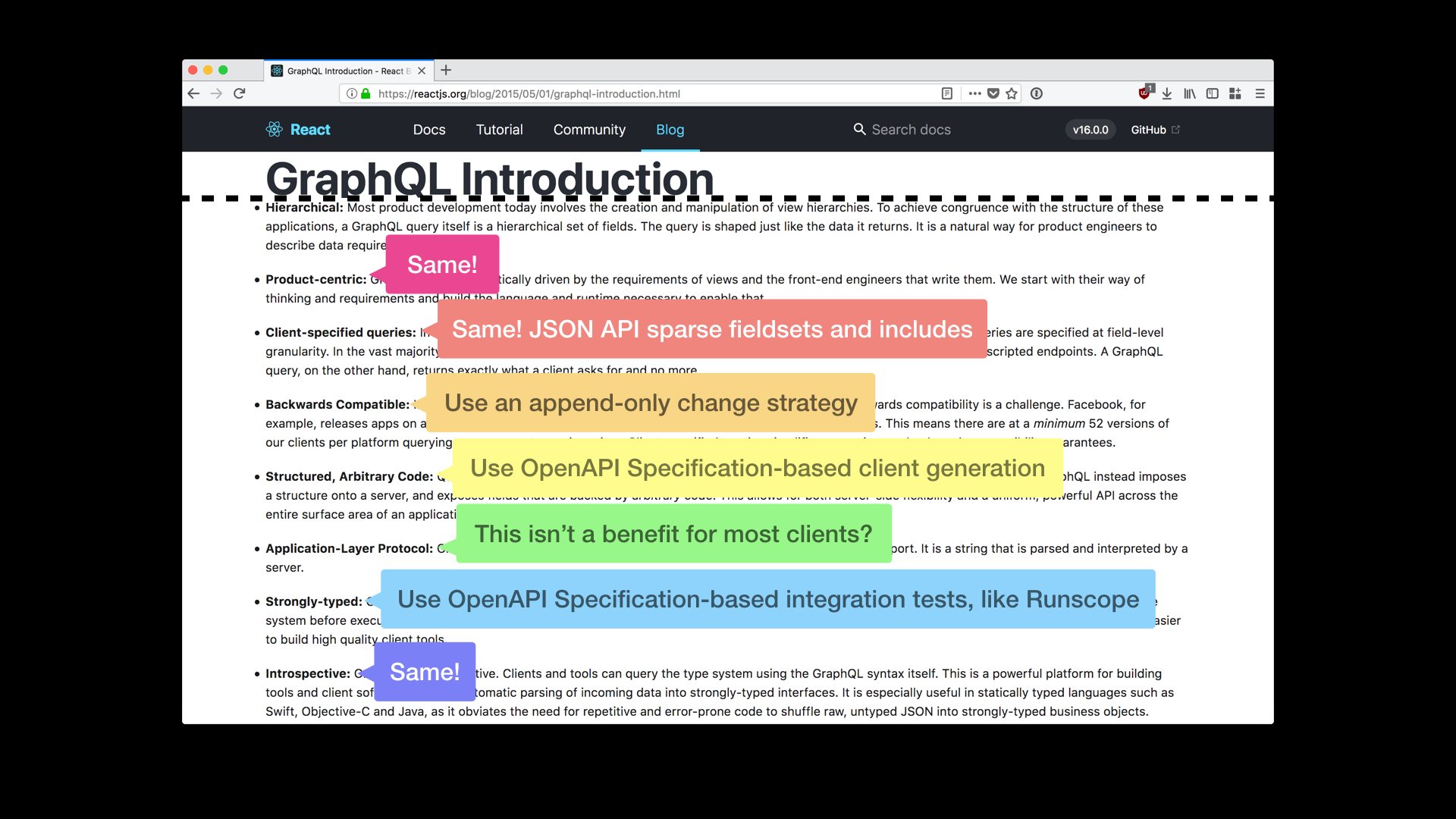 In conclusion, I hope that I’ve convinced you to consider JSON API for your next Web API. While I think GraphQL is an advancement in API design, I think the JSONAPI.org specification addresses the concerns of client developers better.