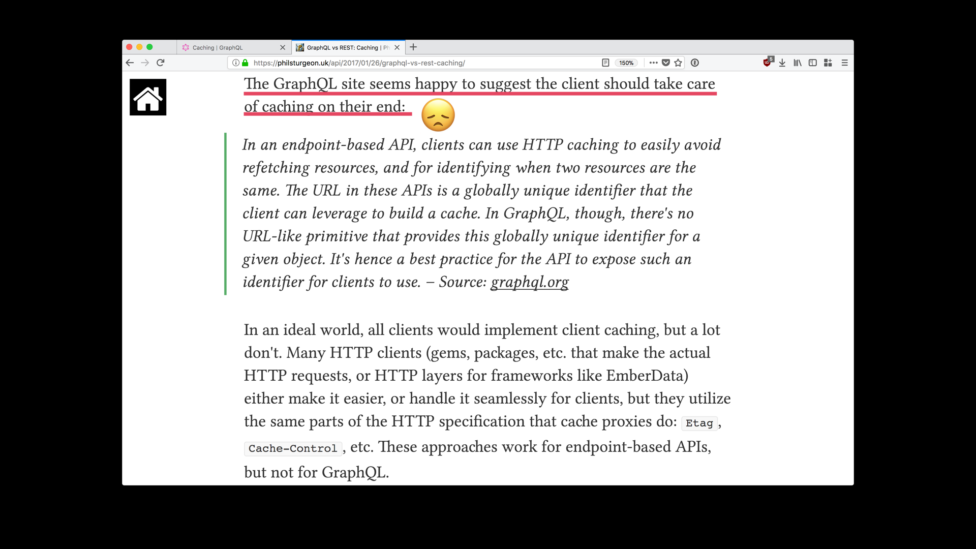 But unlike JSON API, GraphQL does not leverage the built in caching features of HTTP and does not have a suggested common approach to caching. If a client developer works with multiple GraphQL-based APIs, they will likely need to learn and accomodate multiple caching methods. More so, an effective caching mechanism is difficult to implement when clients compose the response from multiple server data sources. I believe that caching is too important of a client performance consideration to be an afterthought.