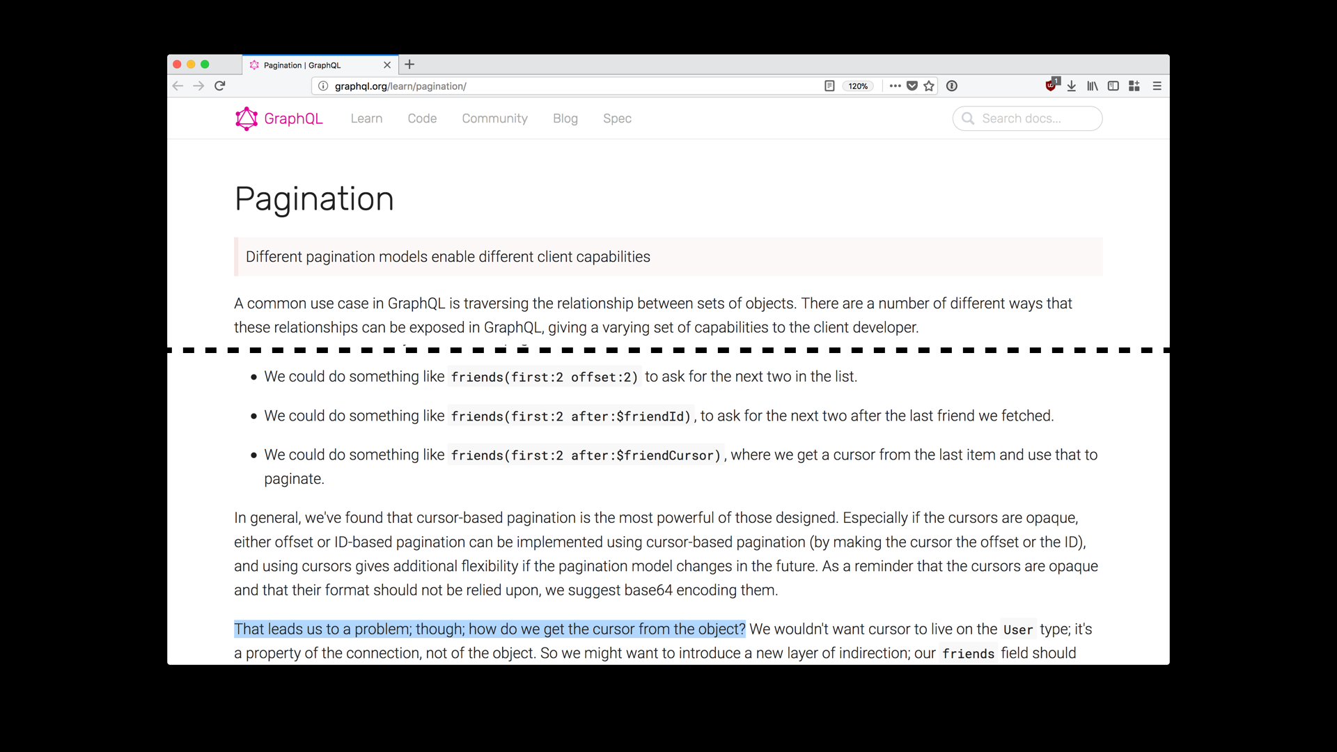 Pagination in GraphQL is done by the client. This is unfortunate, because it makes it very easy for clients to make very expensive database queries. For example, when paginating with offset, many databases still needs to process all of the query results first and then apply the offset by only returning a portion of the computed results to the client. As the offset grows, the amount of processing on the server grows. I won’t get into a details about cursor strategies for pagination, but I do believe this should not be something clients should have to worry about. Again, I think the pagination use case is too important and too common to be an afterthought.