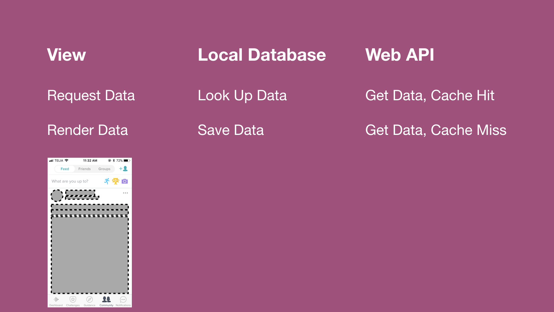The first example is for fresh data. The view is going to request the data from the client local database. The database won’t have it, so it’s going to fetch it from the Web API. It will be a cache miss because it hasn’t retrieved it before. The database will save the response from the server, which will cause the view to render.
