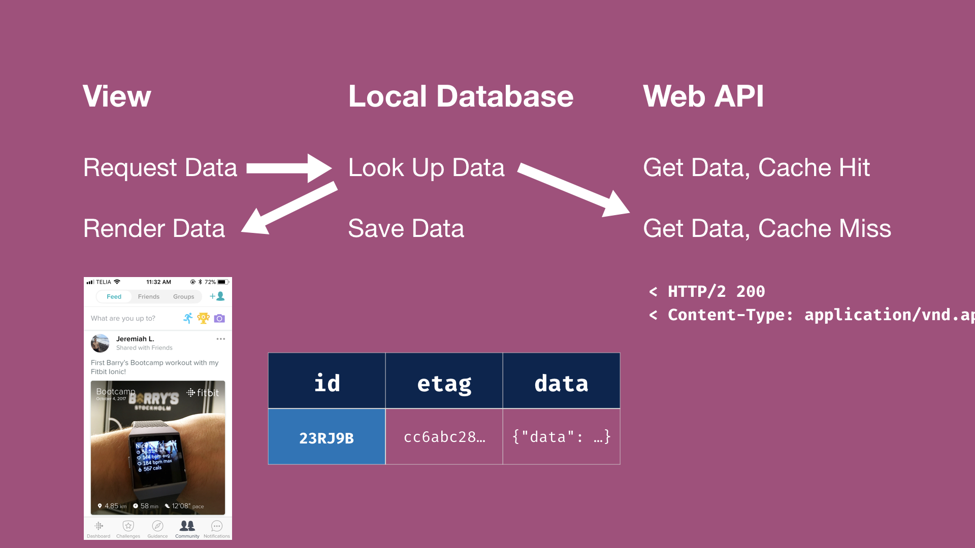 One of the challenges at Fitbit was not just getting clients to agree to common data models, but getting them to agree on a common way of retrieving, storing, and presenting data. This part is not related to the JSONAPI.org spec, but I think it’s important—it is how a client can leverage the features within the API to improve the perceived and actual performance of the end-user experience.