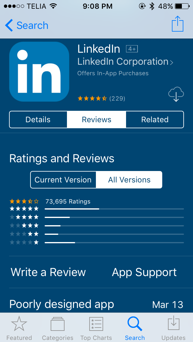 I then proceeded to finally enjoy the newsfeed that I came to the app for. However, after 2 more seconds, a sticky banner appeared on the bottom of the screen. It told me “LinkedIn is faster” in its iOS app. Speed isn’t a problem I’ve ever had on LinkedIn, but at least the value statement is better than “works better”. For the third time within 15 seconds, I tapped UI to reject an unwelcome distraction.